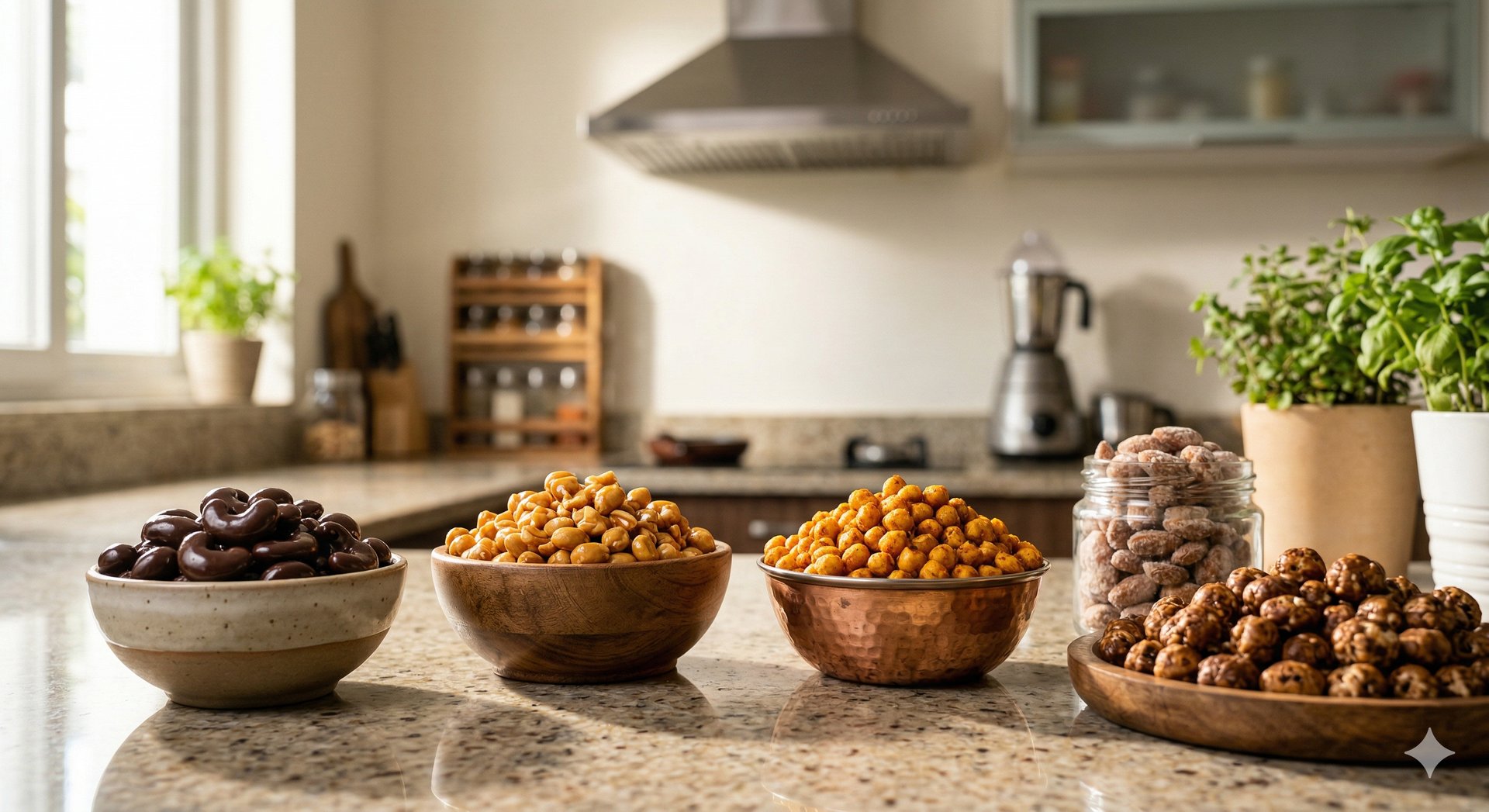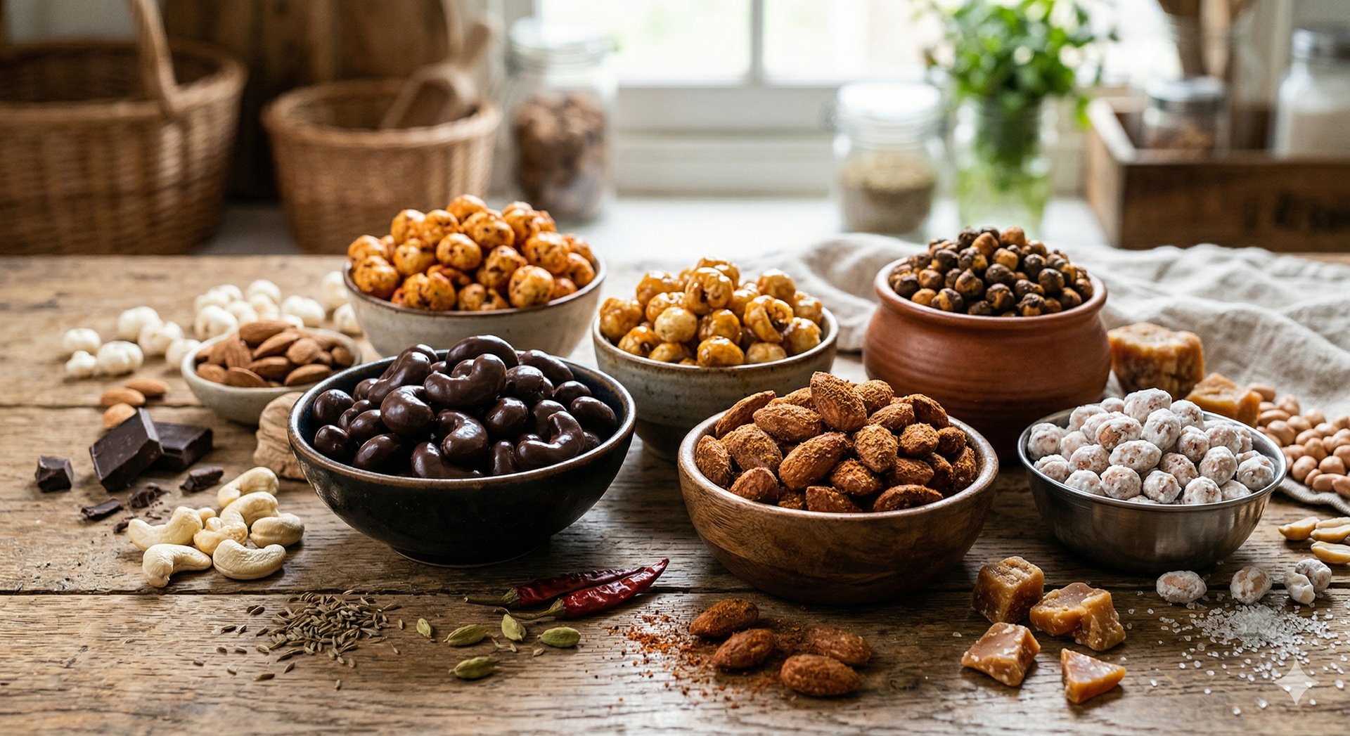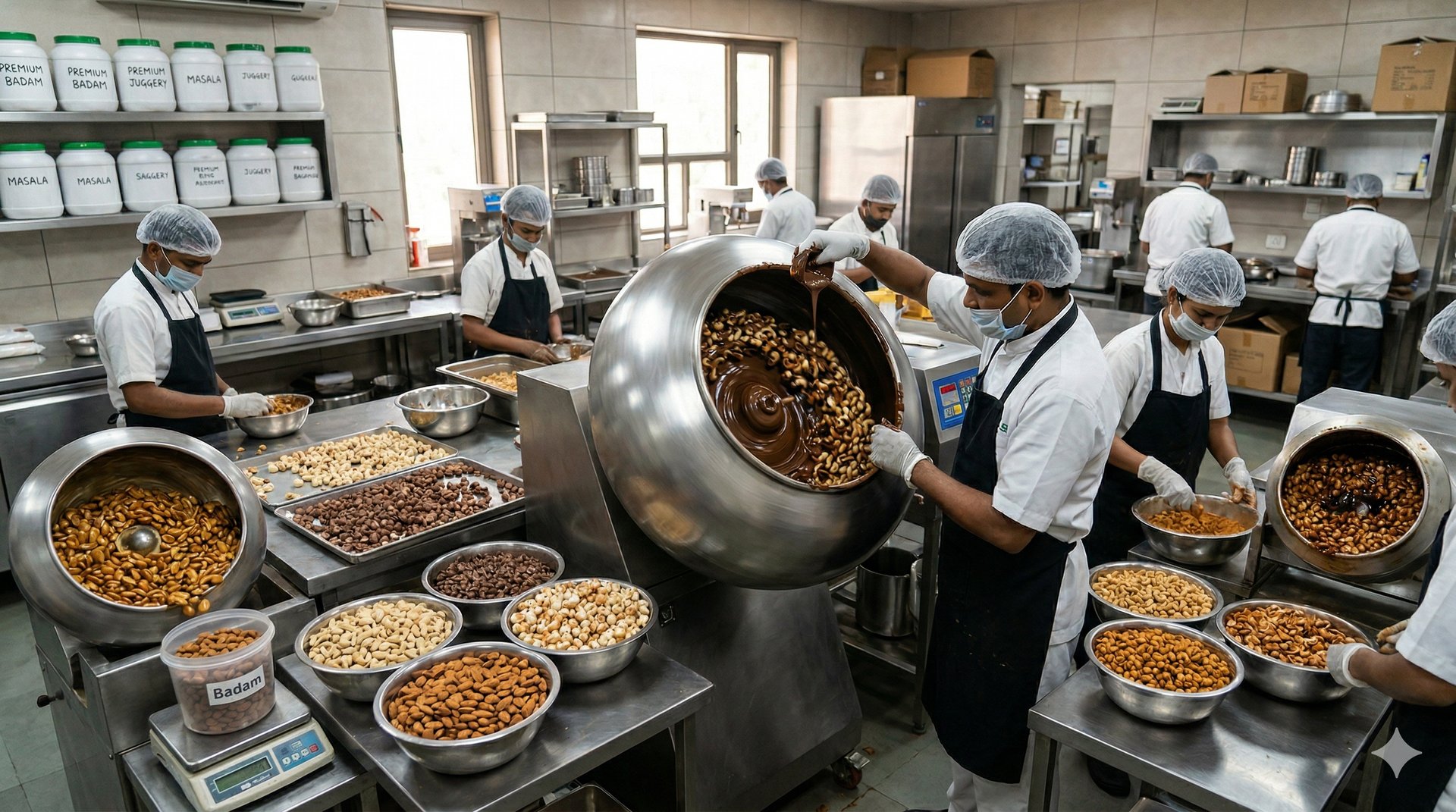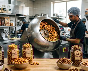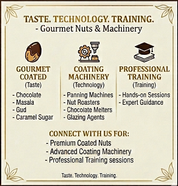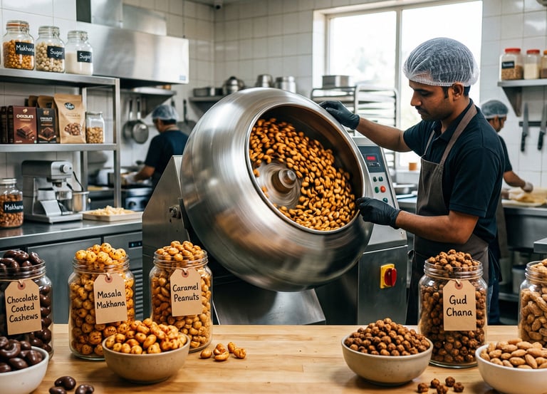 Gourmet Range: Boasting a remarkable selection of 230+ distinct coating solutions, our gourmet variety includes everything from classic Chocolate Cashews and Masala Badam to specialty Gud (Jaggery) Chana, Caramel Cashews, and Sugar-Coated Nuts.